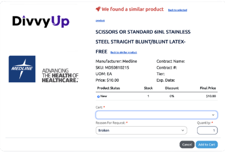 Our comprehensive analytics dashboard consumes hospital utilization data from the sterile processing information system identifying inventory demand, excess and standardization opportunities. The marketplace provides hospitals with shopping cart simplicity allowing departments to match inventory needs in a buy/sell exchange driven by data visibility. In a few words – we help you Divvy Up to drive savings and efficiency.